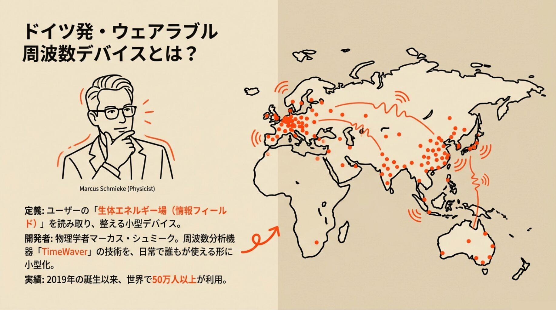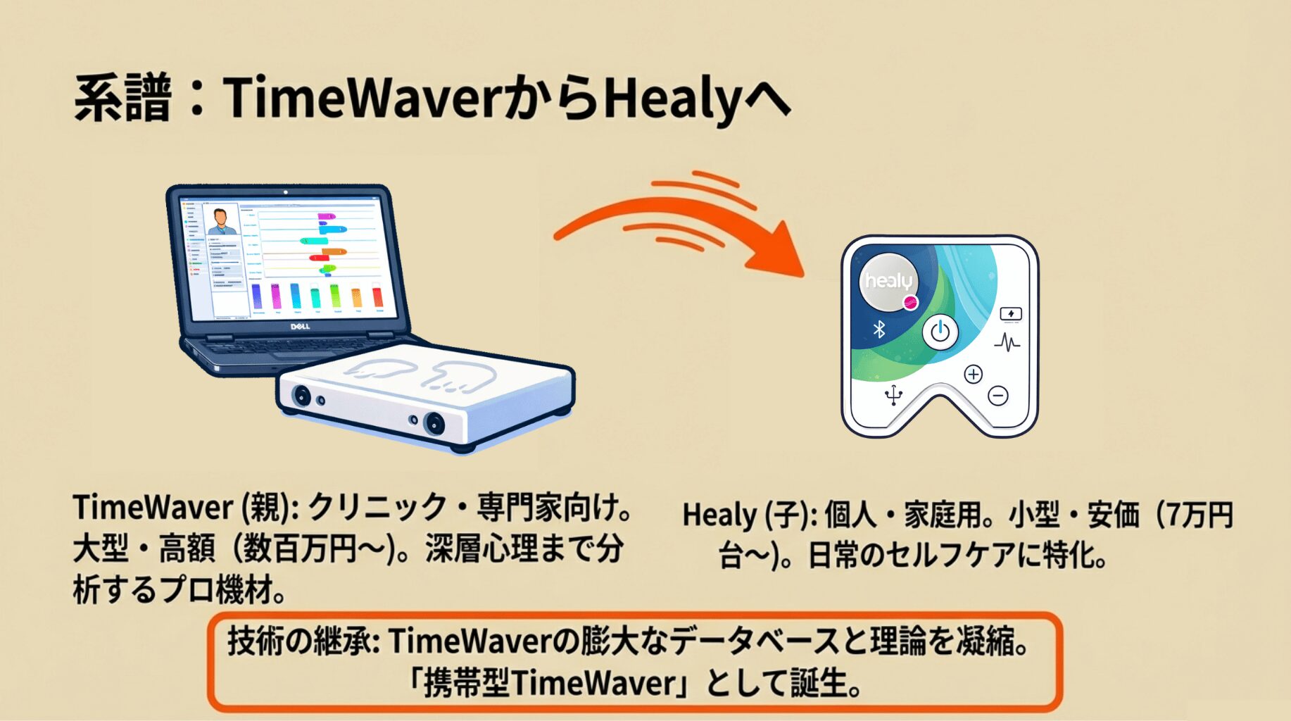 前述の通り、両者ともマーカス・シュミーク博士によって開発されており、情報フィールド理論と周波数テクノロジーが土台になっています 。TimeWaverで培われた膨大な周波数データや解析アルゴリズムを、Healyも受け継いでいる点で密接に関連しています 。言わばHealyは「携帯型TimeWaver」として、根本の理論は同じくしつつ一般ユーザー向けに使いやすく設計されています。