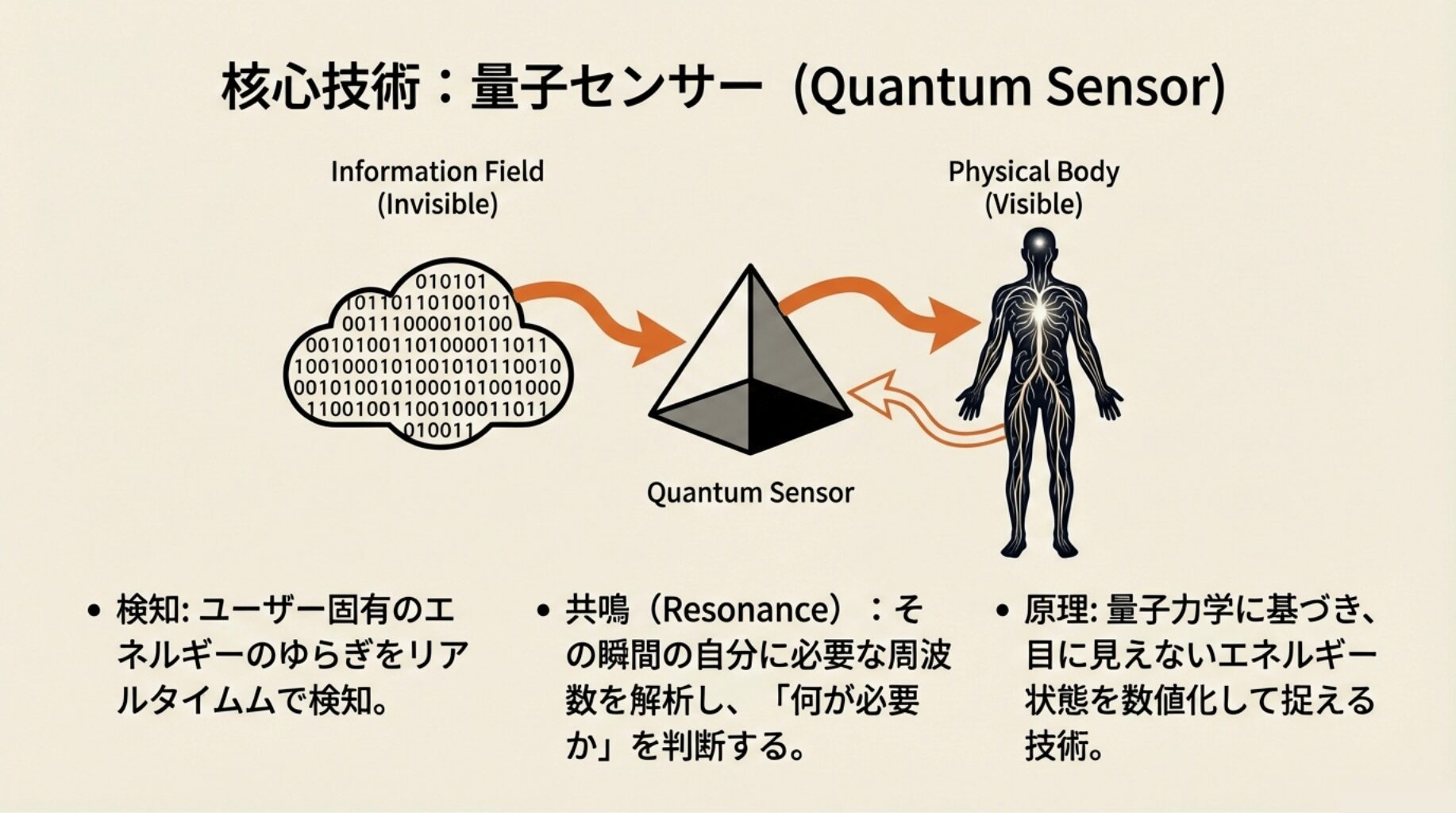 いわゆる「情報フィールド」(見えないエネルギー場)の解析によって、その時のユーザーに共鳴(Resonance)する周波数を読み取り、何が必要かを判断します 。これは量子力学の仕組みをもとにした技術で、私達の心や体を取り巻くエネルギーのゆらぎを読み取ることができるのが特徴です。