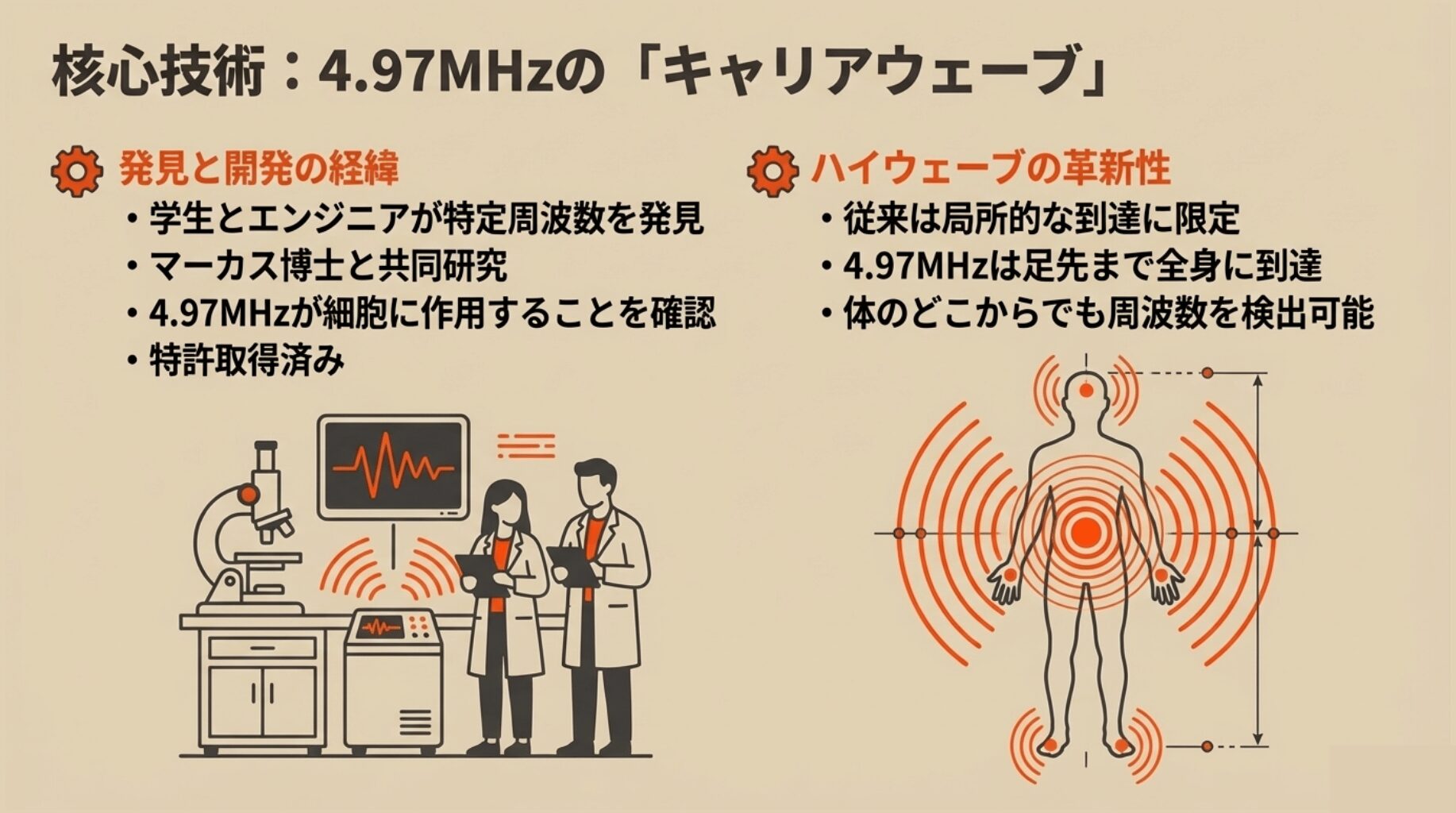 学生とエンジニアによって発見された特定の周波数。それが、情報伝達のカギとなる「キャリアウウェーブ」として非常に有効であることが判明しました。この周波数を用い、タイムウェーバー・ヒーリ開発者のマーカス博士との共同研究がスタート。多くの実験を重ね、最終的に4.97MHzという高周波が、細胞にまで影響を与える可能性があると分かりました。この研究成果をすぐに発表せず、模倣を防ぐためにまず製品化を優先。こうして誕生したのが、最新デバイス「ハイウェーブ」です。(特許取得済み)