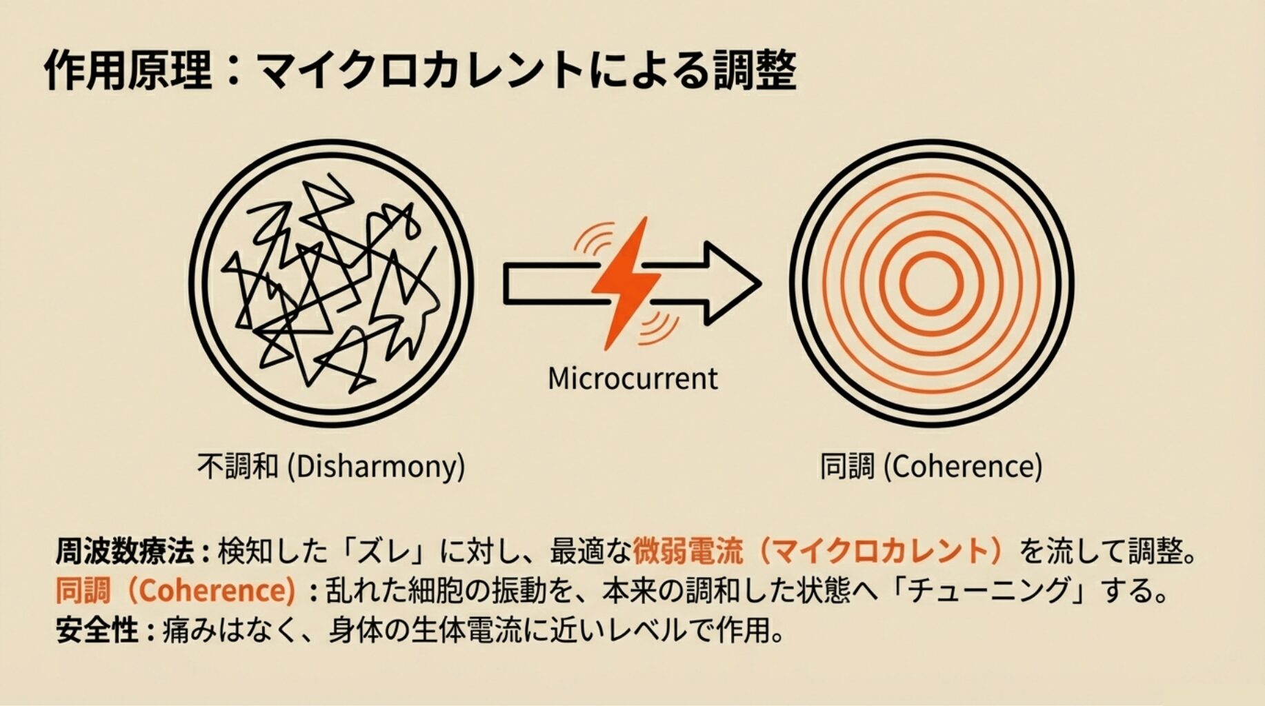 検知したズレや不調和に対して、Healyは周波数療法の考えに基づき、最適な微弱電流周波数(マイクロカレント)を体に流して調整します 。例えば、特定の体の部位や機能、システムに対応する電気的な周波数を送り、細胞や生体の振動を整えることで、本来のバランスを取り戻すサポートをします 。この過程は痛みもなく安全に行われ、乱れた波動を元の調和した状態へと共振させるものです。