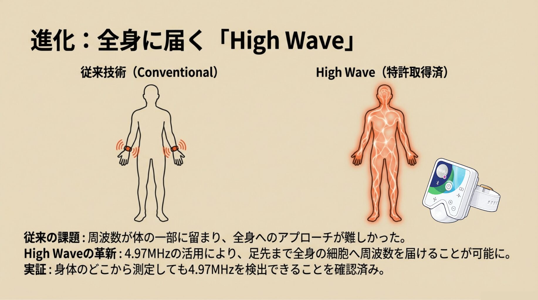 これまでのヒーリーでは、振動数が体の一部にしか届かず、全身へのアプローチが難しいとされてきました。しかし今回、革新的な周波数「4.97MHz」の発見と、それを応用した新デバイス「ハイウェーブ」の登場により、ついに“全身の細胞”へと周波数を届けることが可能になりました。