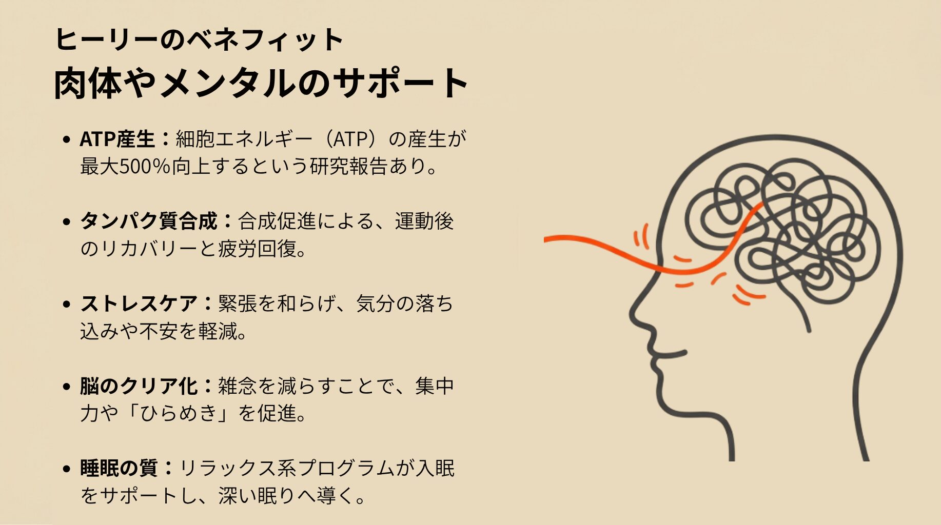 ヒーリーのベネフィット(心身の健康サポート、集中力・睡眠改善、エネルギー活性化 など)