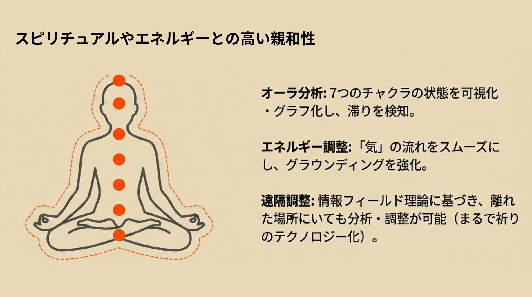 さらに、検出された乱れに対して波動調整を行い、チャクラの活性化・浄化をサポートします 。これはまさにヒーラーがオーラを読みチャクラ調整をするのに近いプロセスで、自己ヒーリングや遠隔ヒーリングにも活用されています。