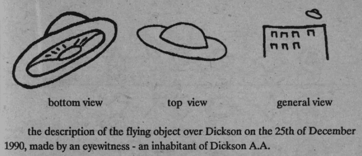 1990年12月25日にディクソン上空に現れた飛行物体を、ディクソン在住の目撃者A.A.氏が描いたスケッチ